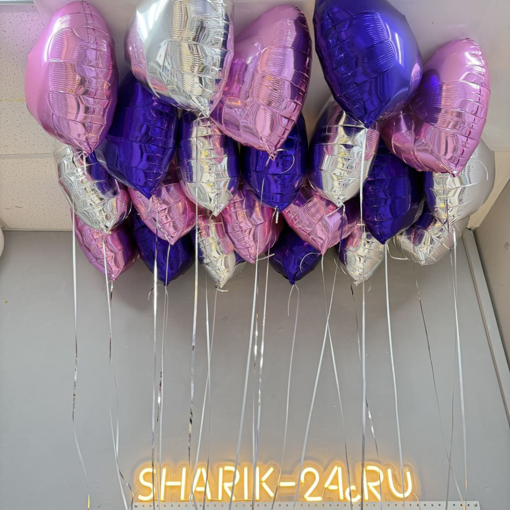 Шарики фольгированные сердечки серебро, фиолетовые и розовые