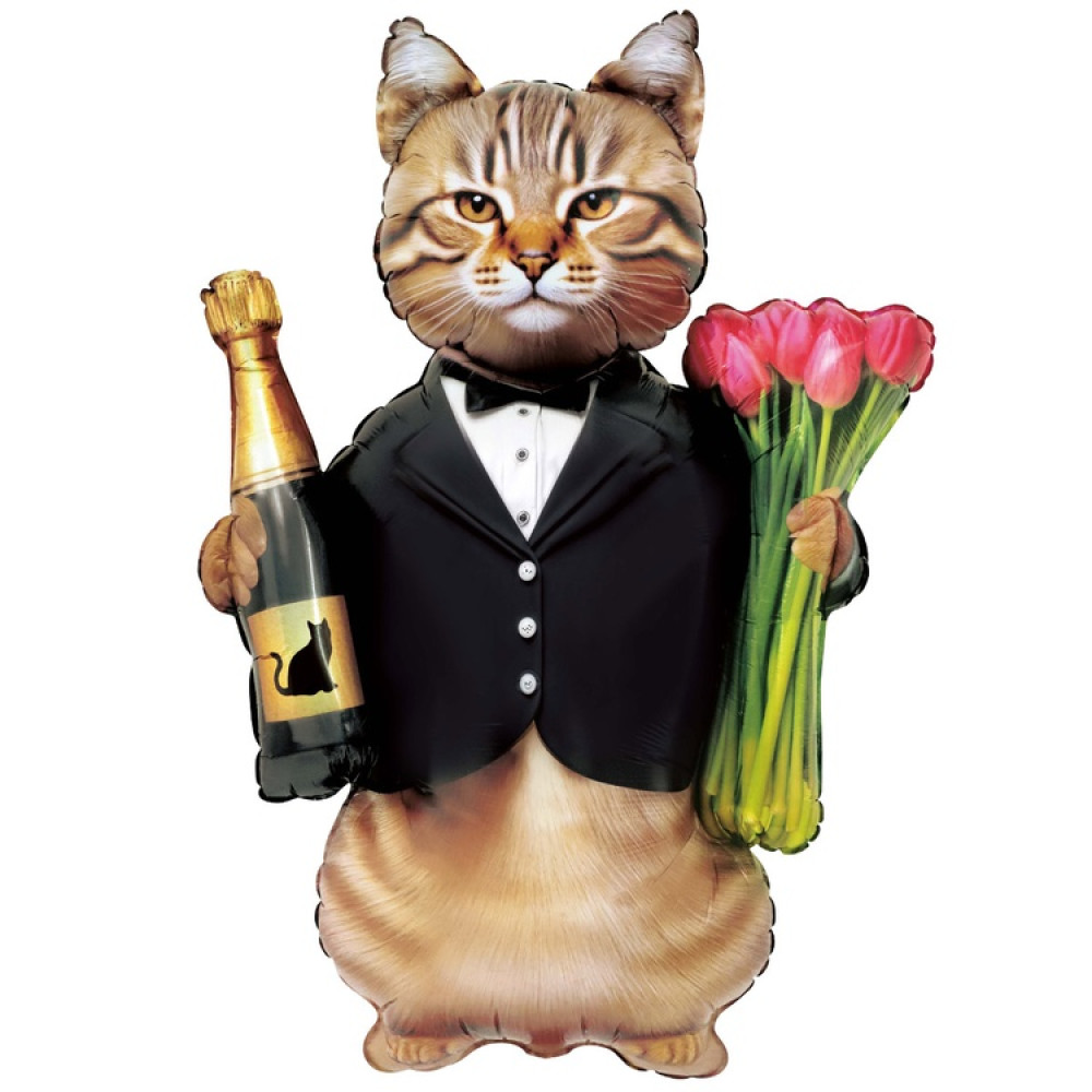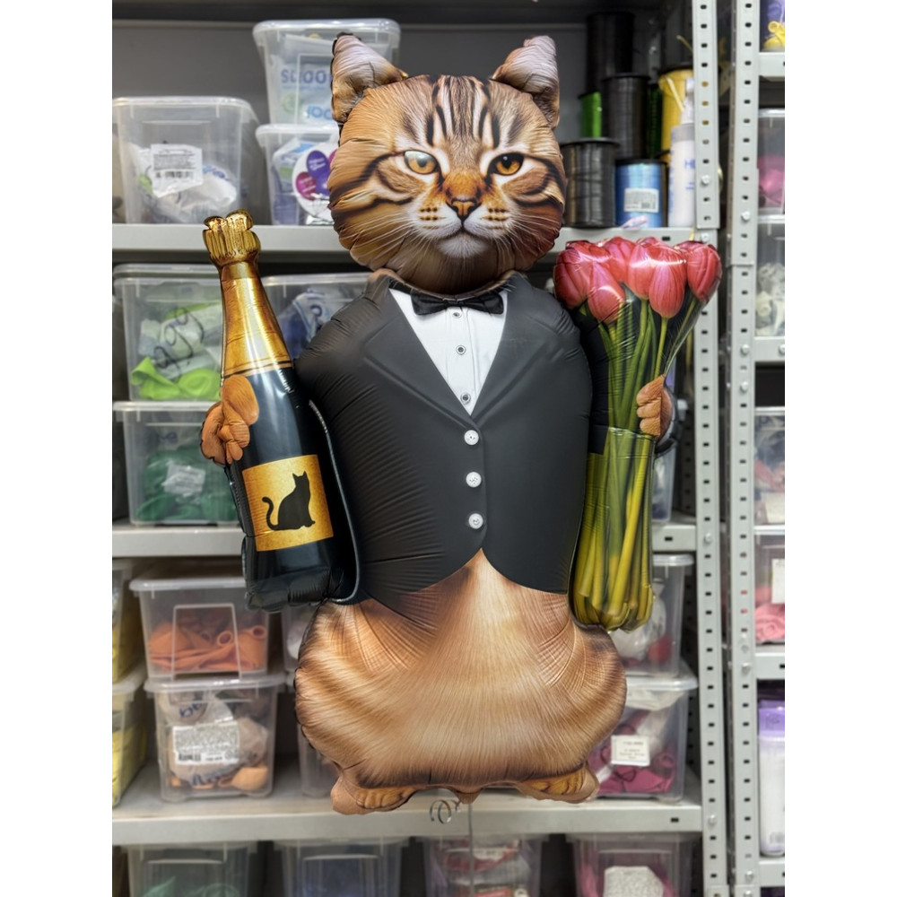 Воздушные шар кот с тюльпанами и шампанским