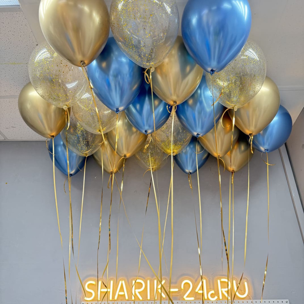 Шары с гелием под потолок хром золото, синие и шары с конфетти золото